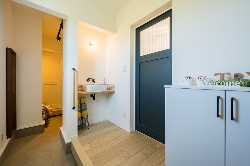 玄関フロアには洗面所と大容量のシューズクローク。洗面所が玄関フロアにあると帰宅後にすぐに手洗いなど出来て、より衛生的な暮らしを実現できます。シューズクロークはキッチンのパントリーへと繋がっているので、買い物から帰って来ても、靴を履いたまま荷物を運ぶことが出来て便利です。