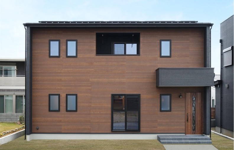 ブラックの外壁にアクセントで木目を使ったナチュラルモンダンな外観。