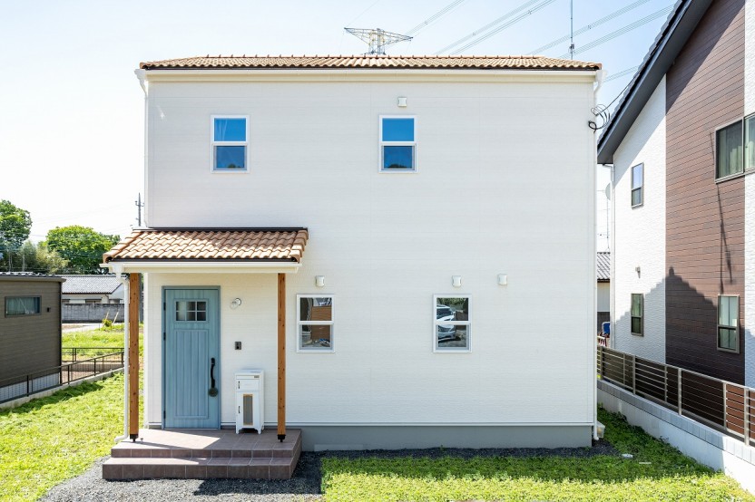 オレンジ色の瓦屋根と白い外壁のかわいい外観
