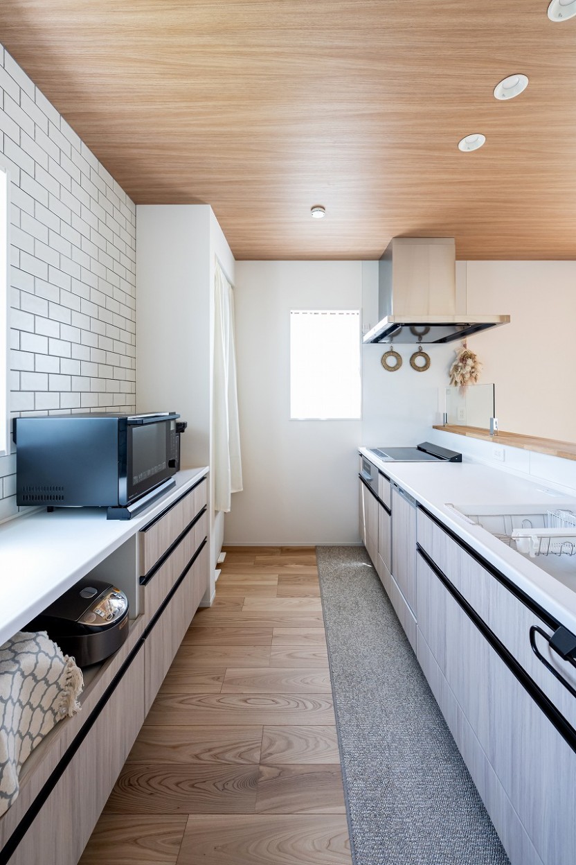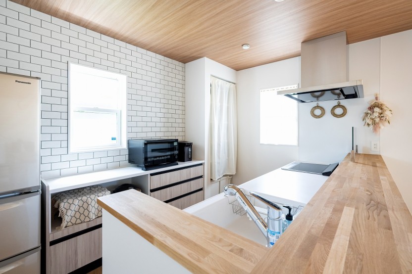 艶のあるサブウェイタイルがおしゃれで明るいキッチンスペース