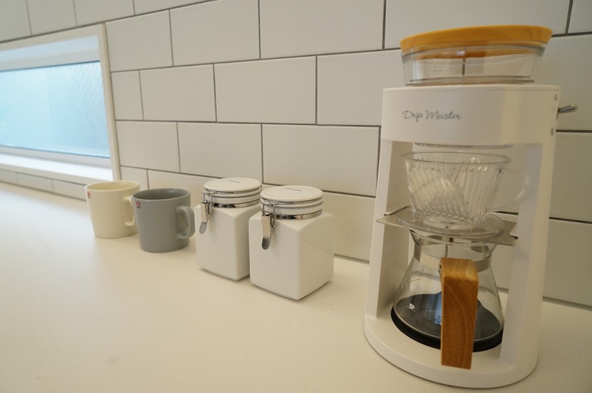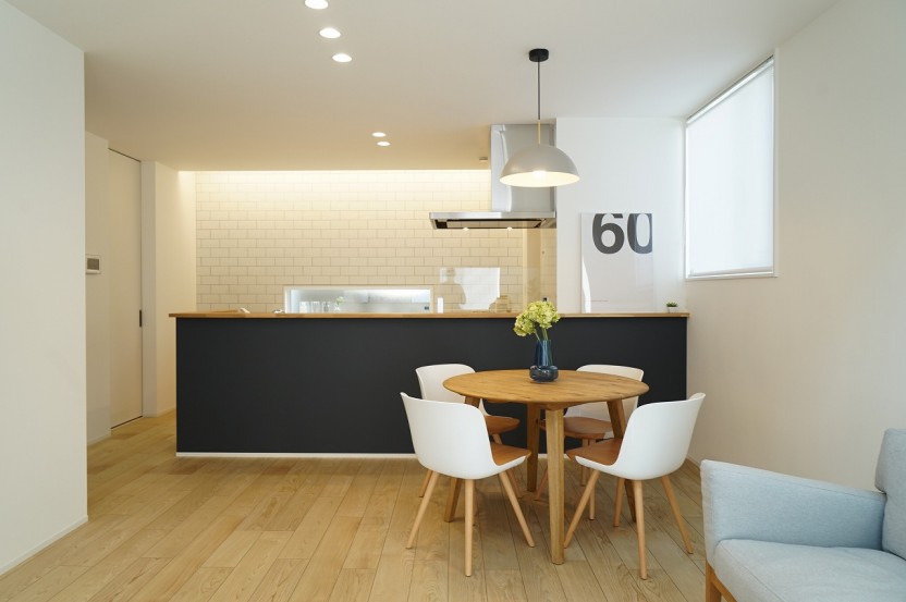 ホワイトのタイルと間接照明ですっきり感と清潔感のあるキッチンスペース。ブラックのクロスを横長に使用した事で、空間のアクセントになり、横幅を広く感じさせます。