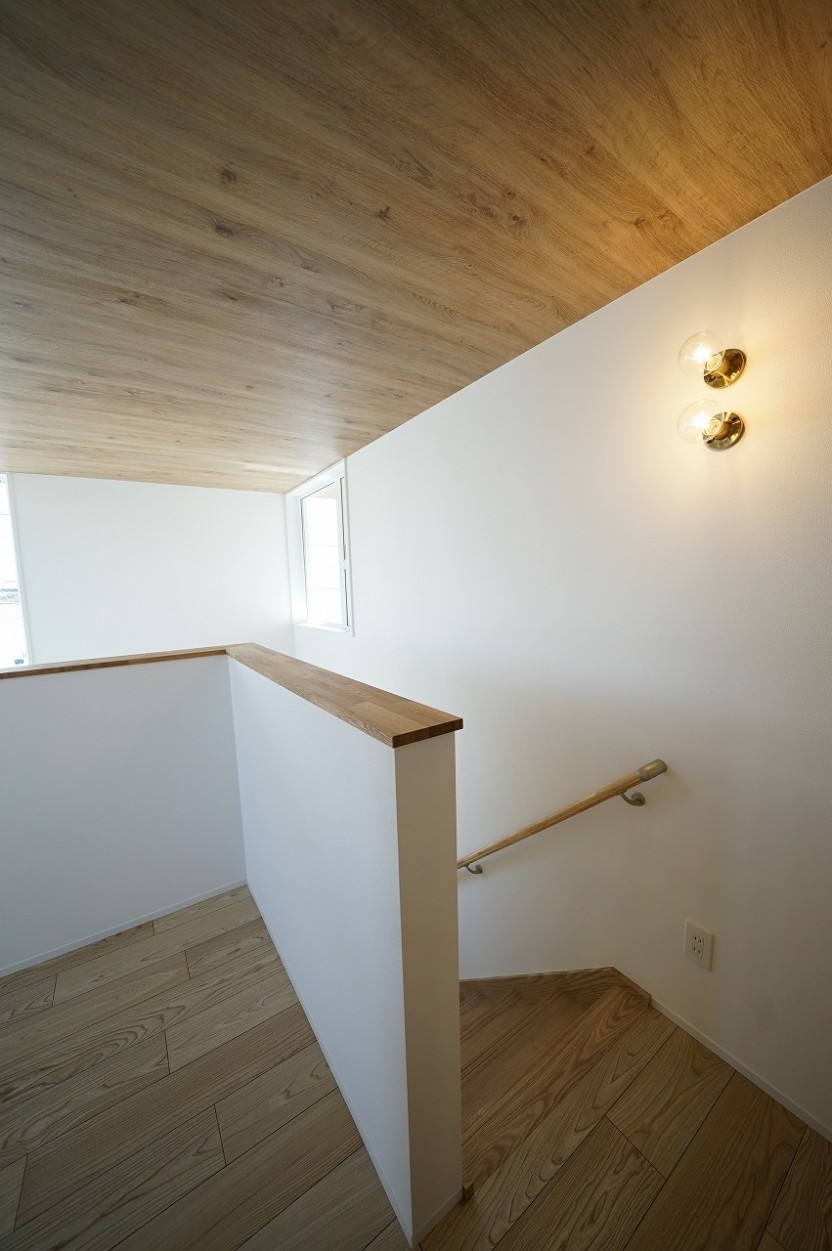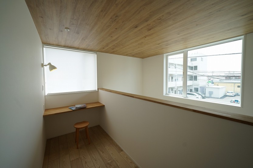 フローリングと合わせた木目天井でナチュラル感がある多彩な2Fスペース。テレワークからアイロン掛けなど家事にも使える造作テーブルを設置。室内干しも出来るように洗濯用金具も。