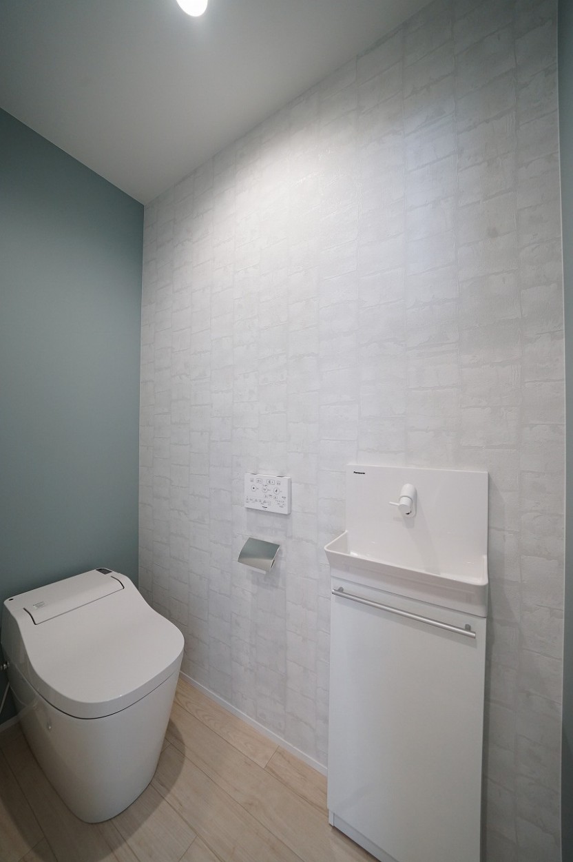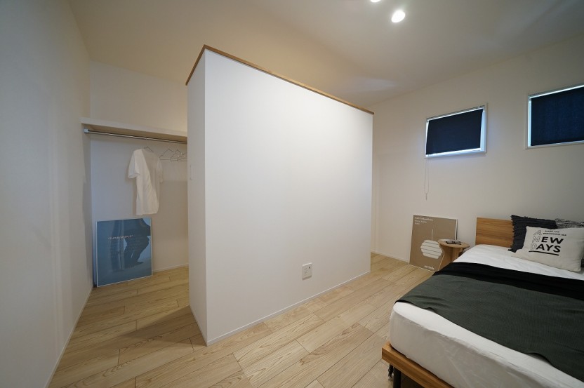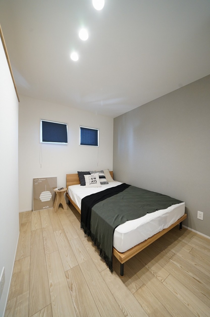 グレーのモルタル調のクロスを貼った主寝室。シンプルな色合いですが、すっきりと落ち着く空間に仕上っています。