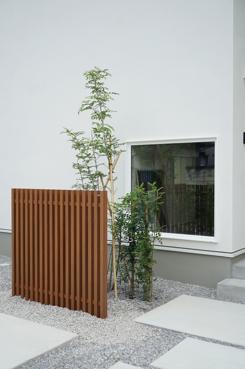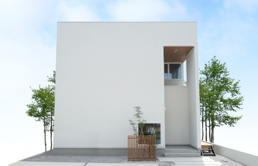 真っ白なキューブ型の建物。外壁は世界No.1シェアとクオリティーを誇るドイツの塗り壁『Sto塗装』。継ぎ目がなく、高級感がありスッキリとした外観になりました。