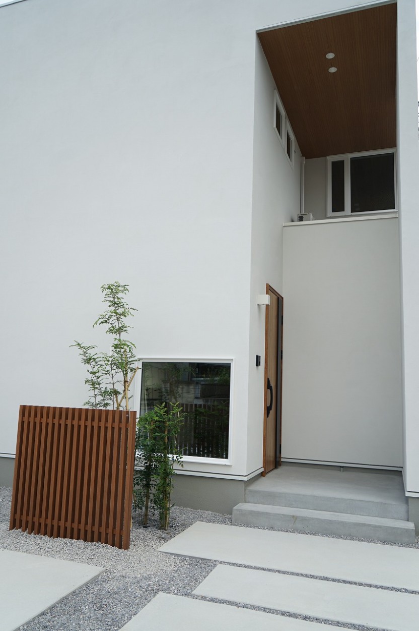 木目の軒天と玄関ドアを合わせてナチュラルモダンで高級感のある外観。吹き抜け玄関による解放感とコンクリート金ゴテ仕上げによる無機質でスッキリとした玄関ポーチ