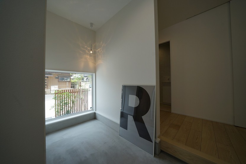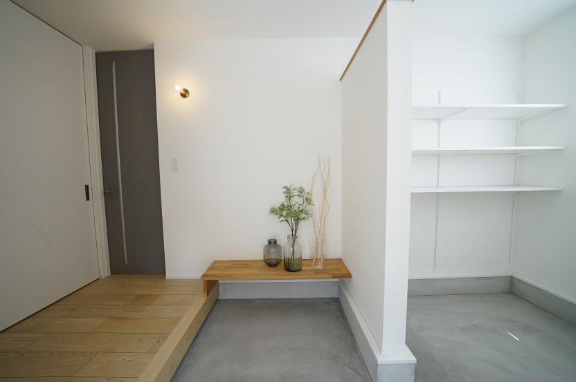 土間のある玄関。土間玄関とシューズクロークを繋げる事で広々としたスペースになりました。造作のベンチは腰かける事や飾り棚としても使えます