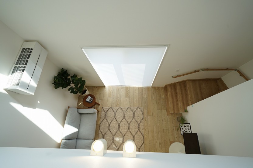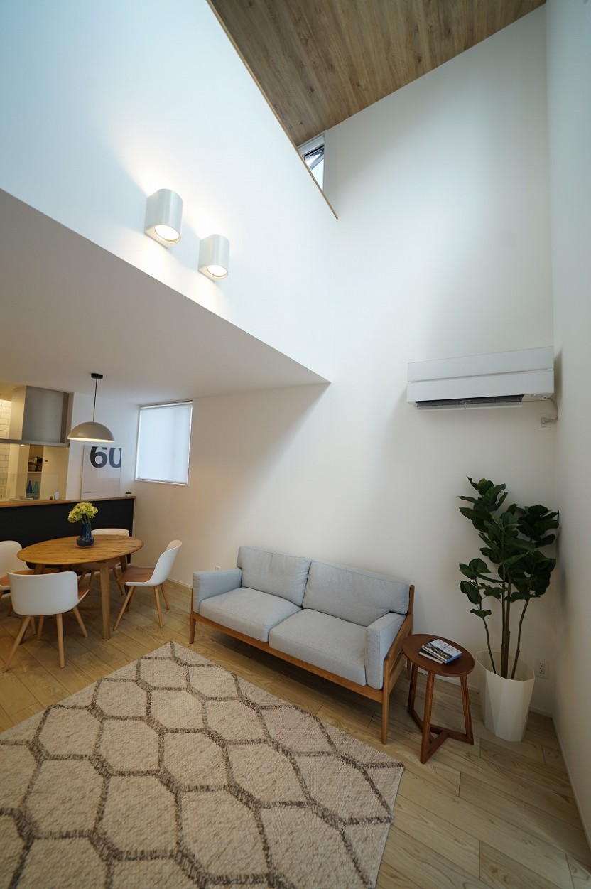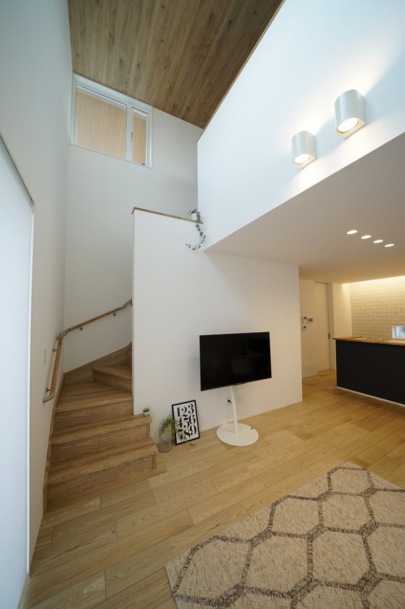 吹抜けのある18畳の広々としたLDK。吹き抜けを作る事で平面的な広がりだけでなく、より立体的にすることができます。