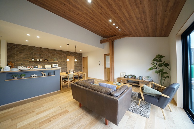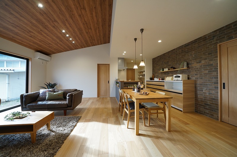 羽目板張りと高い勾配天井で開放的&広くゆとりあるLDK