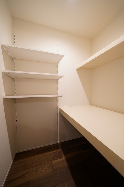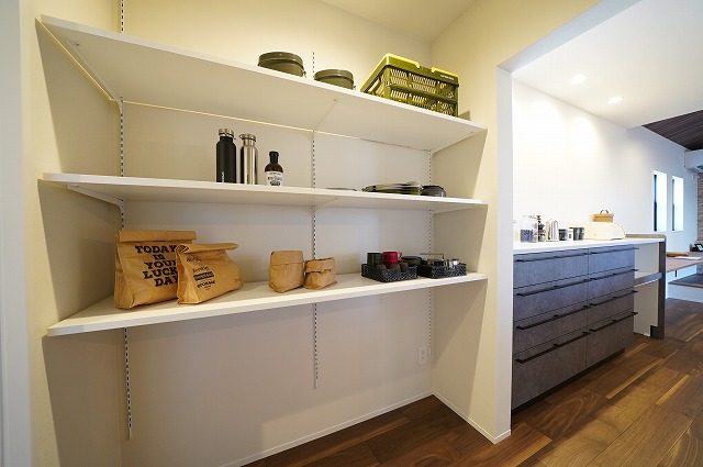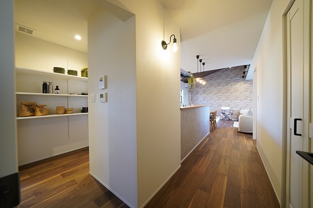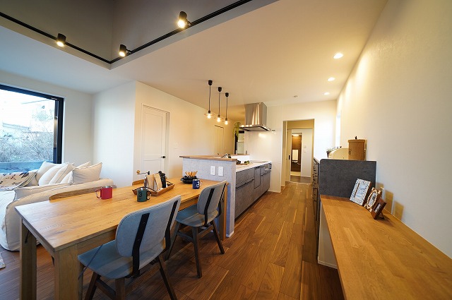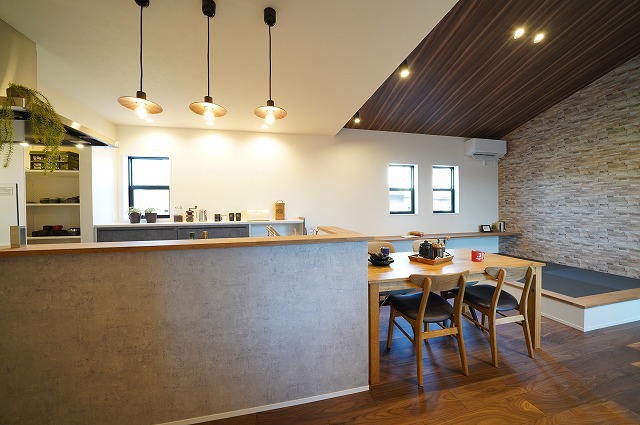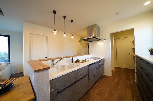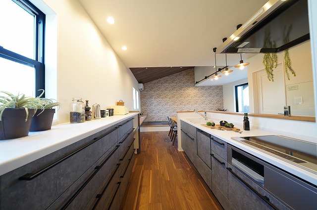 コンクリート柄のクロスがカッコいいキッチンスペースは家事楽回遊動線