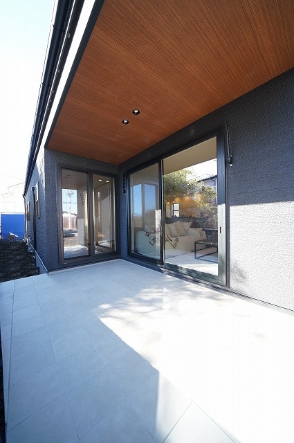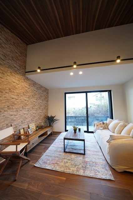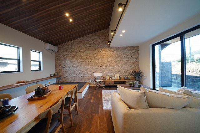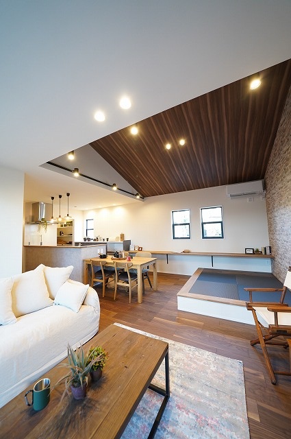タイルデッキに繋がるリビングは木目の勾配天井で広さと高さを演出