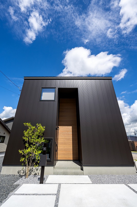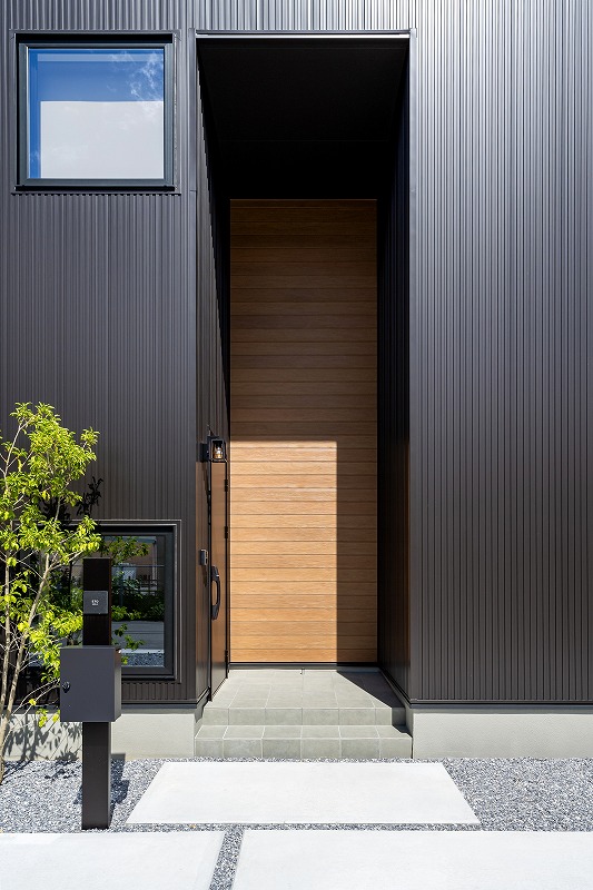 黒いガルバリウム鋼板と木目をアクセントに使ったスタイリッシュな外観