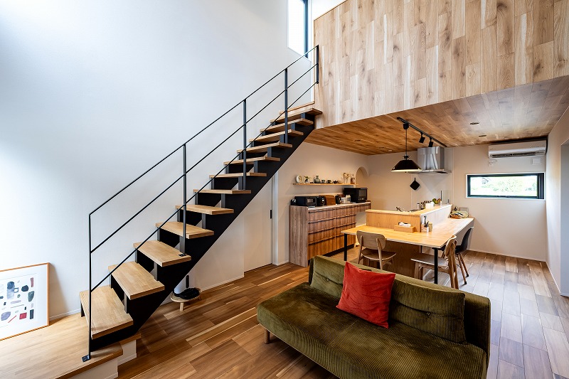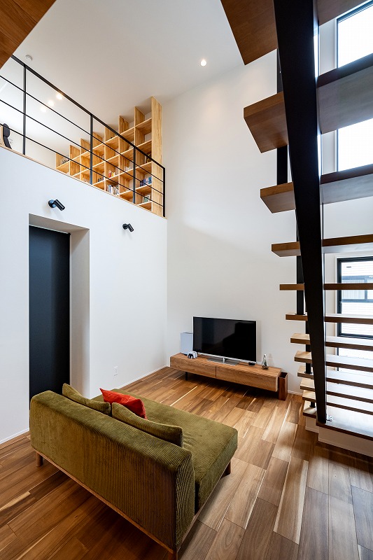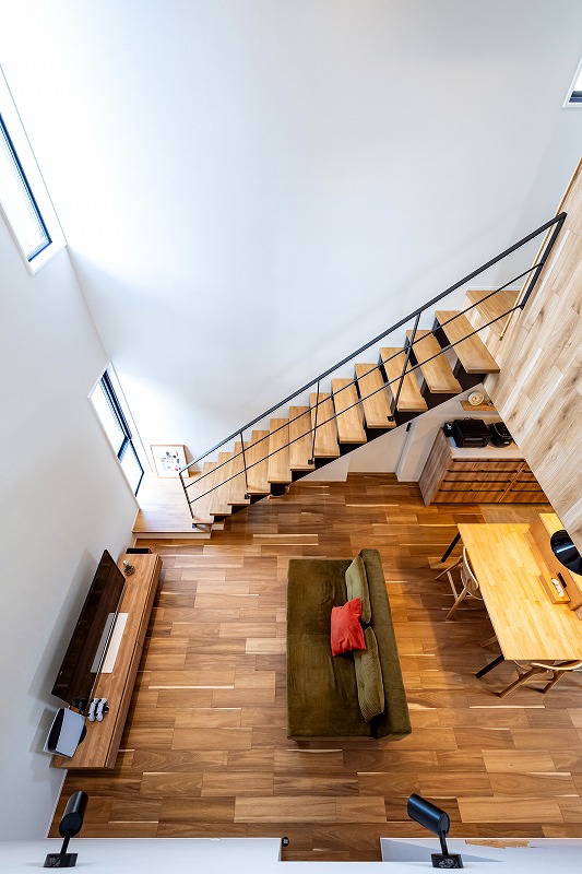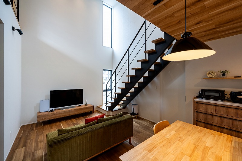 吹き抜けの空間に鉄骨階段が映えるリビング