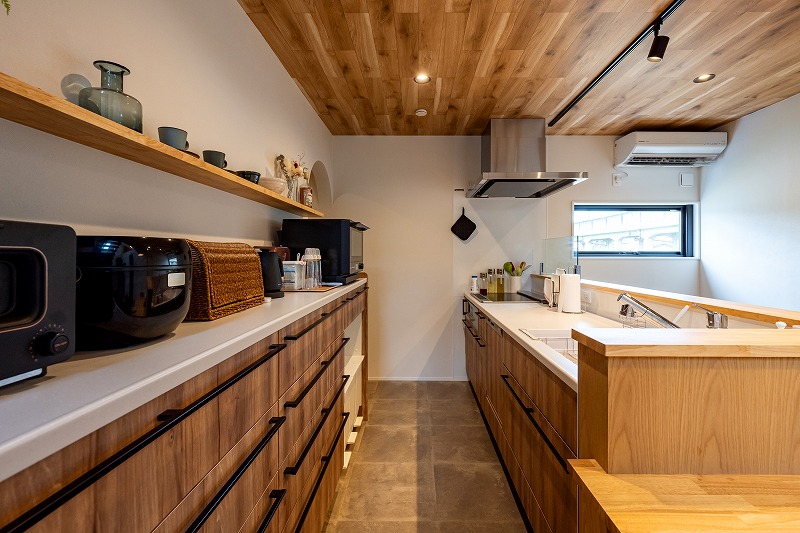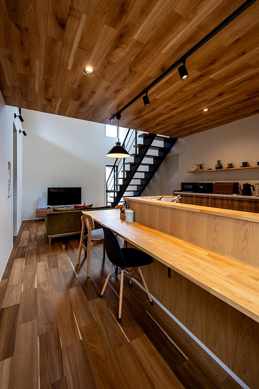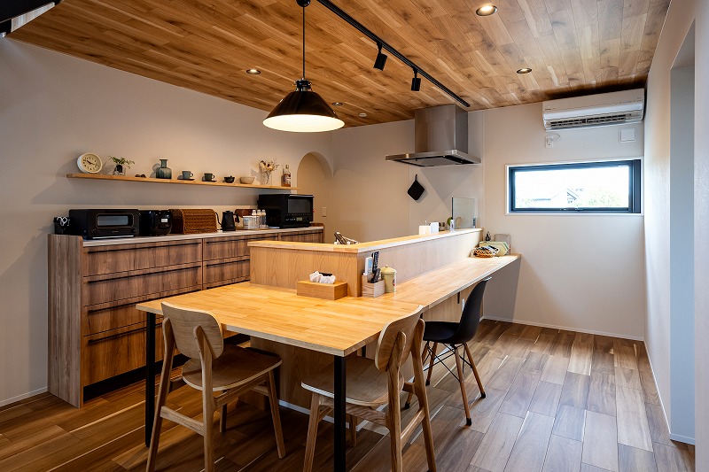 キッチンカウンターのあるカフェのようなキッチンダイニング