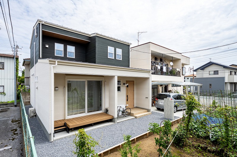 ホワイトとオリーブが織りなすナチュラルでモダンな外観