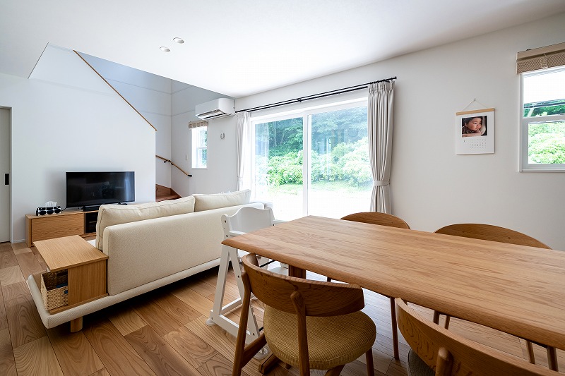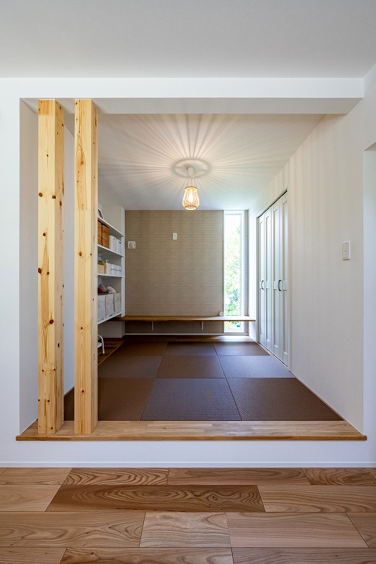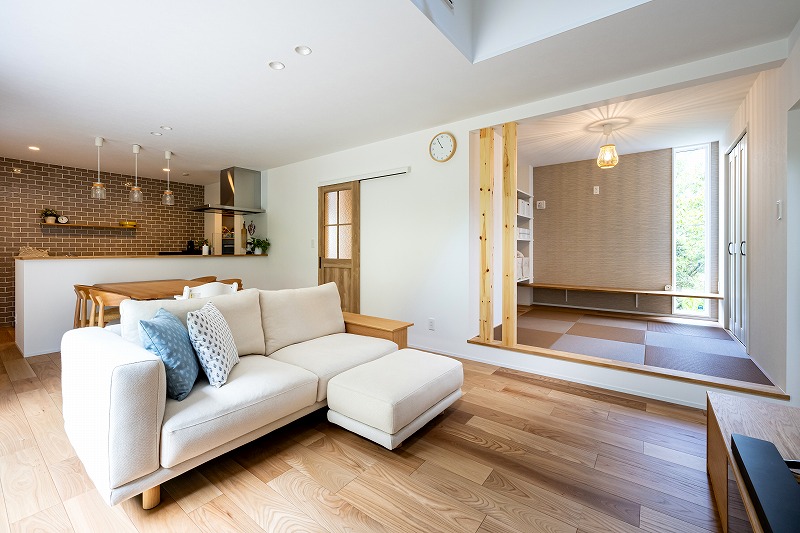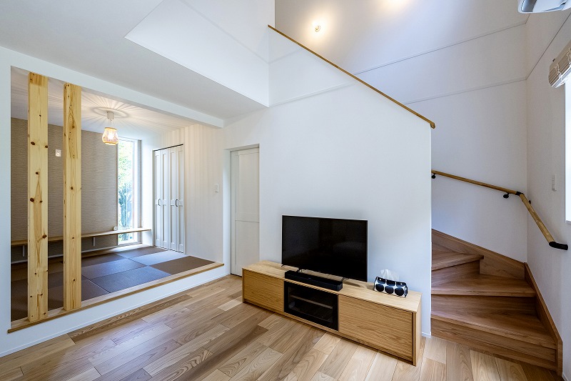 吹き抜けと小上がりの和室がプラスしたことで広さと高さを演出したLDK
